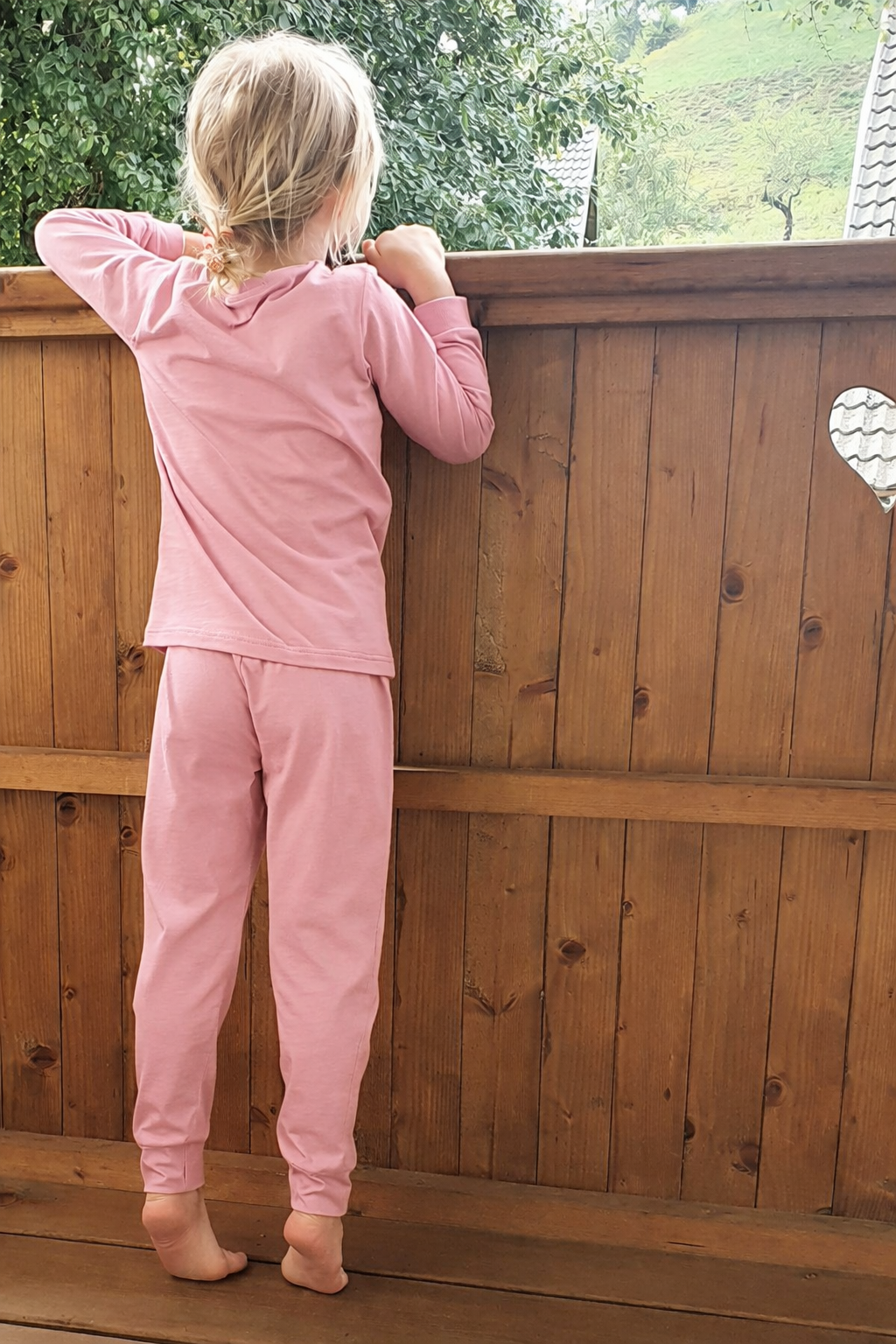 Dekliška pižama iz eko bombaža za prijeten spanec vaših otrok.  Lahka in prijetna pižama, ki diha s telesom. Etično, trajnostno in ročno narejeno v Sloveniji.