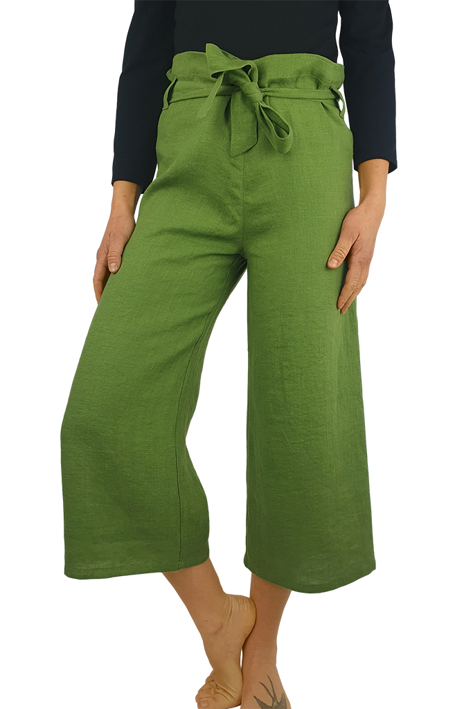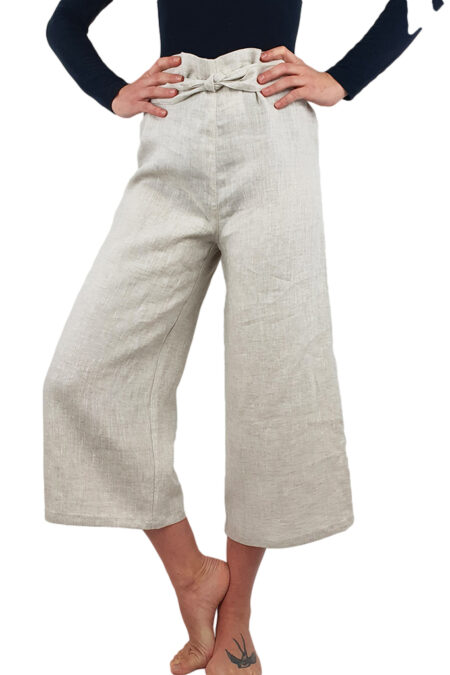 Ženske lanene hlače SARAH iz prijetnega in mehčanega 100% lanu. Lahke in udobne, s pasom in zadrgo zadaj. Etično, trajnostno in ročno narejeno v Sloveniji.